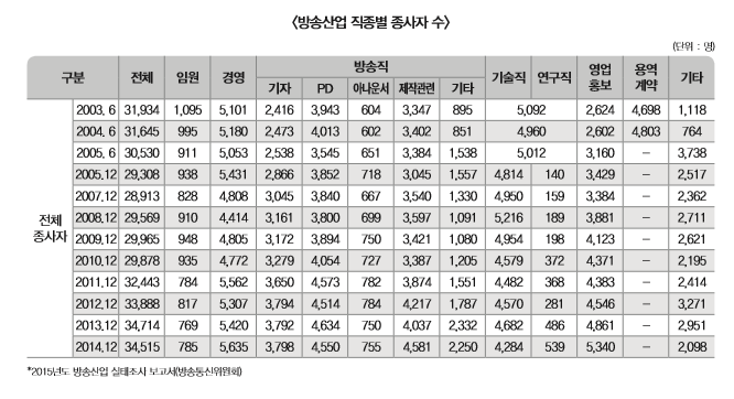 방송통신위원회의 「2015년 방송산업 실태조사 보고서」에 의하면, 방송프로듀서(PD)는 2014년 12월말 기준 4,550명으로 조사되었다. 이는 2013년의 4,634명에 비해 84명이 감소한 수치로, 2010년 처음으로 4,000명대에 진입한 이후 2011년 4,573명, 2012년 4,514명, 2013년 4,634명, 2014명 4,550명으로 증감을 반복하고 있다. 방송국의 프로듀서들은 방송사의 경영 악화로 신규 인력 채용이 잘 이뤄지지 않는 편이다. 또한 상당수의 프로그램이 외주제작으로 전환되고 있기 때문에 방송국 소속이 아닌 외주제작사의 프로듀서를 중심으로 고용이 나타나고 있다. 한편, 외주제작사는 소규모이고 예산 부족으로 실력이 우수한 경력직을 중심으로 채용하기 때문에 신입들은 치열한 입직경쟁을 치러야 하고, 유명 연출자와 그렇지 않은 연출자의 대우도 큰 차이가 있다. 독립프로덕션이나 종합유선방송사의 경우 규모가 작고 계약직 직원이 많으며, 근무환경이나 임금이 열악한 편이다.