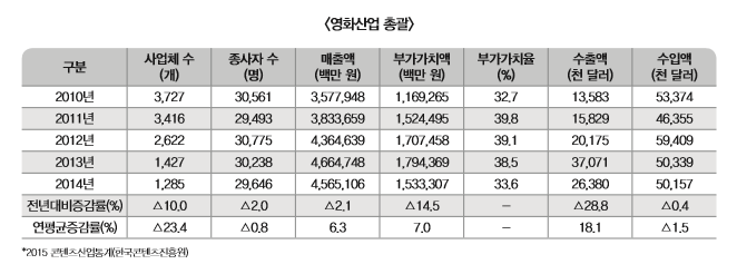 영화산업의 경우, 양적 수치가 전체적으로 긍정적인 편은 아니다. 한국콘텐츠진흥원의 「2015 콘텐츠산업통계」에 따르면, 2014년 영화산업 사업체 수는 지난 5년 동안 계속해서 감소해 전년과 비교해 10.0%가 줄었고, 종사자 수와 매출액, 부가가치액도 전체적으로 감소세를 보이고 있다. 대신 수출액이 2013년 급격한 증가를 보인 것을 예외로 하면(‘설국열차’의 선전), 수출은 여전히 성장세를 보이고 있다. 한국영화의 극장 티켓 파워와 디지털 온라인 시장의 성장, 해외 수출액의 증가세 등으로 영화산업은 계속해서 발전할 것으로 전망된다. 또한, 우리나라 국민의 영화에 대한 애정이 상당한 데다가, 여가 선용 차원에서 영화를 즐기는 관람객 수는 계속해서 늘어날 것으로 보인다.