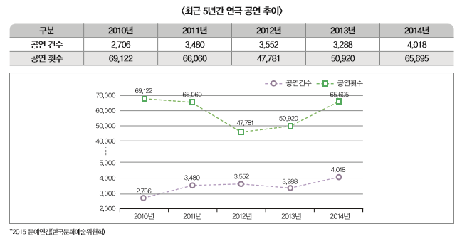 연극 분야의 경우, 삶의 질 향상과 여가문화에 대한 관심 증대 등에 힘입어 공연이 꾸준히 제작되고 있다. 한국문화예술위원회 「2015년 문예연감」의 최근 5년간 연극 공연 추이를 살펴보면, 2014년 공연 건수는 총 4,018건으로, 2010년 2,706건, 2011년 3,514건, 2012년의 3,552건, 2013년 3,288건으로 조금씩 증가한 것으로 나타났다. 공연 횟수는 2010년 69,122회, 2011년 66,060회, 2012년 47,781회로 감소하다가, 2013년 50,920회로 전년대비 3,139회 증가하고 2014년은 65,695회로 전년대비 14,775회 증가한 것으로 나타났다.