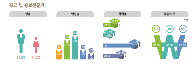 대기업뿐만 아니라 중소기업, 공공기관, 그리고 소규모 판매업자에 이르기까지 다양한 홍보방안을 마련하고자 하는 수요는 지속적으로 늘어날 것으로 보여 광고 및 홍보전문가의 고용증가에도 긍정적 영향을 미칠 것으로 보인다.