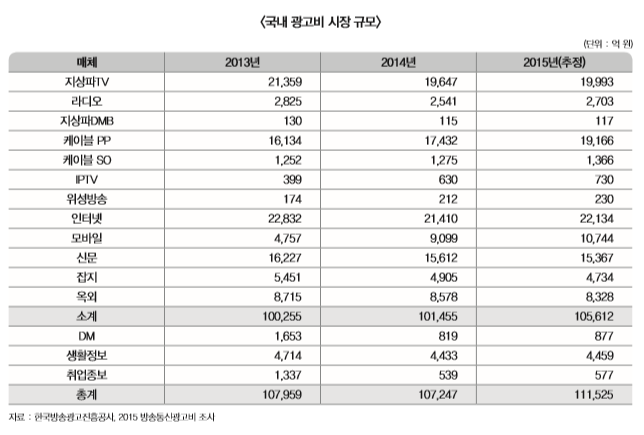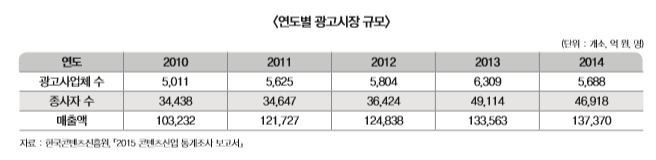 한국콘텐츠진흥원의 「2015 콘텐츠산업 통계조사 보고서」에 따르면 광고산업의 사업체 수는 2010년 5,011개 업체에서 2014년 5,688개 업체로 677개 증가했으며 종사자 수와 매출액도 매년 증가추세이다.