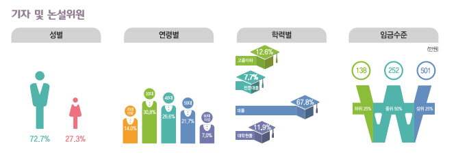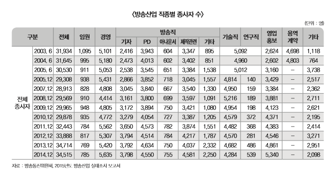 방송통신위원회의 「2015년 방송산업 실태조사 보고서」에 따르면 방송기자는 2003년 2,416명에서 2014년 12월 기준 3,798명으로 꾸준히 증가한 것으로 나타났다. 이 중 2014년 기준 전체 방송기자의 59.1%인 2,246명이 지상파방송사 소속이고, 종합유선방송 294명, 중계유선방송 0명, 위성방송 0명, 방송채널사용사업 1,258명, IPTV 0명으로 대부분 지상파방송사와 방송채널사용사업 부문에서 활동하는 것을 알 수 있다. 이 중 종합유선방송 기자는 2003년 174명에서 294명으로, 방송채널사용사업의 기자는 2003년 370명에서 2014년 1,258명으로 늘어나, 방송기자의 활동무대가 지상파방송에서 종합유선방송 및 방송채널사용사업 부문으로 이동하고 있는 것으로 나타났다. 이러한 경향성은 당분간 지속될 것으로 보이며, 따라서 지상파 방송사의 경우 경기 침체에 따라 경영상의 이유로 신규인력 채용이 갈수록 제한되는 반면, 이를 대신한 일자리가 종합유선방송 및 방송채널사용사업 부문에서 발생할 것으로 전망된다.