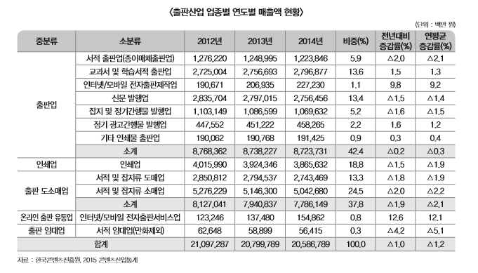 | 출판 도소매업 | 서적 및 잡지류 도매업 | 2,850,812 | 2,794,537 | 2,743,469 | 13.3 | 1.8증가 | 1.9증가 |