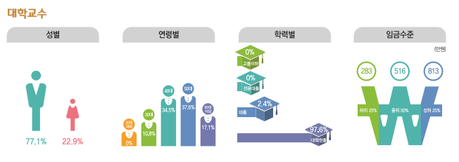 2015년 전문대학은 138개교, 대학은 189개교로 최근 5년간 전문대학과 대학교의 수는 큰 증감 없이 비슷한 수준에 머물러 있다. 또한 국내외에서 박사학위 소지자가 계속 증가하는 등 교수에 대한 수요보다 공급이 절대적으로 많은 상황이어서 향후 대학교수가 되기 위해서는 치열한 경쟁이 뒤따를 것으로 예상된다.