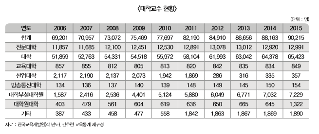 한국교육개발원의 간추린 교육통계(2015)를 살펴보면 대학교수는 2008년 73,072명에서 지속적으로 증가하여 2015년 90,215명(23.5%)으로 증가하였다. 특히 전문대학원의 수는 2006년 138개에서 2015년 201개로 급격히 증가했으며, 같은 기간에 일반 대학원도 149개에서 183개로 증가하였다. 평생교육 확대에 따라 대학원 교육이 활성화되고 법학전문대학원 등 대학원이 증가하면서 강의를 담당하는 교수의 수가 많이 증가하였기 때문인 것으로 보인다. 또한 2006년 이후 매년 약 1,000~3,000명 내외의 교원이 증가했음을 알 수 있다.