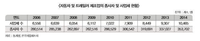 통계청 「전국사업체조사(2015)」에 따르면, 2014년 기준, 자동차 및 트레일러 제조업의 종사자 수는 353,702명이고(자동차 및 자동차부분품조립원 외 종사자도 포함), 사업체 수는 10,465개소이다.