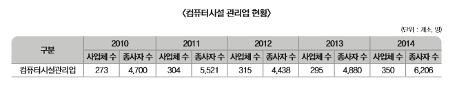 | 컴퓨터시설관리업 | 273 | 4,700 | 304 | 5,521 | 315 | 4,438 | 295 | 4,880 | 350 | 6,206 |