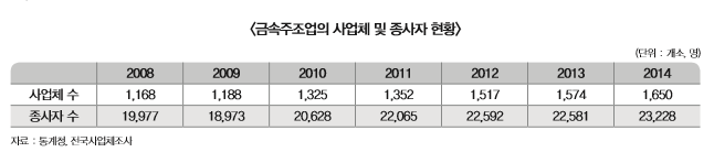 통계청의 전국사업체조사 자료에 의하면 금속주조업의 사업체 수는 2014년 1,650개소이고, 이 산업의 종사자 수는 23,228명으로 나타났다.