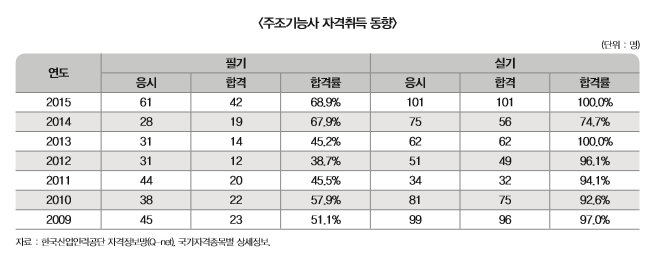 주조원과 관련성이 있는 국가자격인 주조기능사 자격의 취득 동향을 살펴보면, 2015년 기준 101명의 소수 인원이 자격을 취득한 것으로 나타났다.