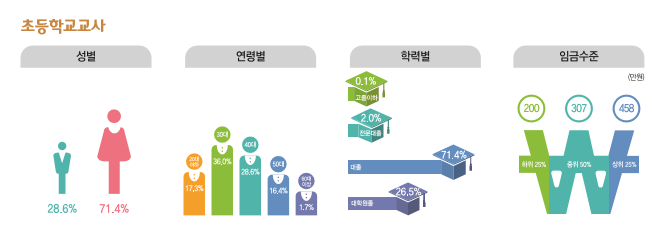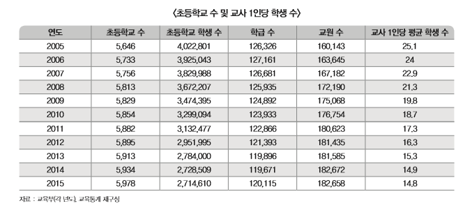 한편, 교육통계연보에 따르면 2015년 초등학교 교원 수는 182,658명으로 2010년 대비 약 3.3% 증가하였다.