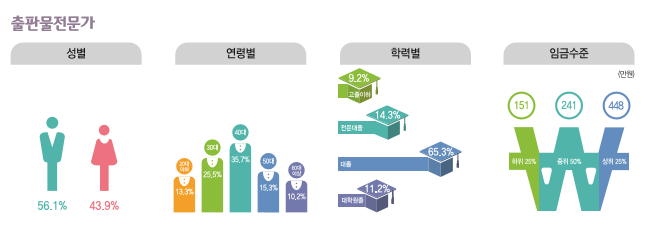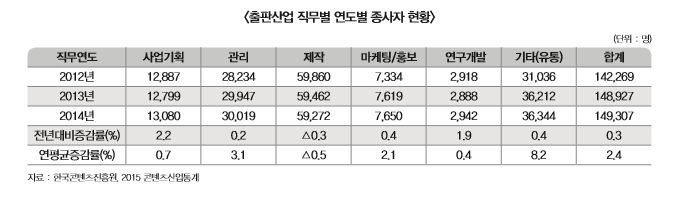 출판산업의 어려움에도 불구하고 한국콘텐츠진흥원의 「2015 콘텐츠산업통계」에서 집계한 출판산업의 직무별 종사자는 2012년 142,269명에서 2013년 148,927명, 2014년 149,307명으로 다소 증가한 것으로 나타났다. 또한 출판물전문가의 주요 직무에 해당하는 사업기획 및 관리, 마케팅/홍보 등의 직무 종사자가 다소나마 증가한 것으로 나타났다.
