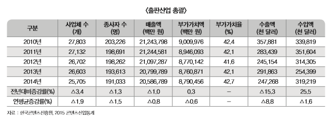 한국콘텐츠진흥원의 「2015 콘텐츠산업통계」에 따르면, 출판산업 전체 사업체 수는 2014년 205,705개로 전년 대비 3.4% 감소했고, 종사자수도 지속적으로 감소해 전년 대비 1.3% 감소한 것으로 나타났다. 매출액도 지속적인 감소세를 보여 2014년 20조 586억으로 전년 대비 1.0%가 감소했다.
