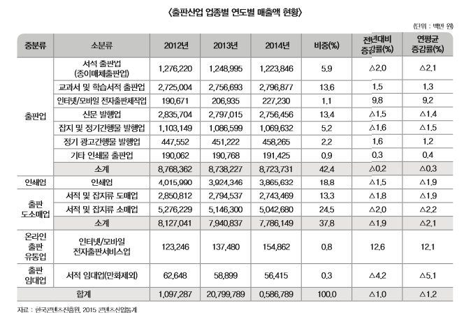 한국콘텐츠진흥원의 「2015 콘텐츠산업통계」에 따른 출판산업의 업종별 연도별 매출액을 살펴보면, 우리나라 출판업 중 서적출판업(종이매체 출판업)의 2014년 매출액은 1조 2,238억 원으로 전년대비 2.0% 감소했다. 교과서 및 학습서적 출판업 매출액은 2조 7,969억 원으로 전년대비 1.5% 증가했고, 인터넷/모바일 전자출판제작업의 증가세는 비교적 커서 2,272억 원으로 전년대비 9.8% 증가한 것으로 나타났다. 하지만 인터넷/모바일 전자출판제작업의 약진에도 불구하고 전체 매출액은 점차 감소하는 경향을 보이고 있다.