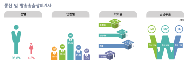 통계청의 전국사업체조사 자료에 의하면, 2014년 현재 통신장비 및 방송송출장비기사가 근무할 것으로 추정되는 방송업 및 유선통신, 무선통신, 위성통신 및 통신재판매업으로 구성된 전기통신업의 사업체는 총 2,423개소로 2008년 2,339개소에 비해 3.6% 증가하였다. 반면에 이들 산업의 전체 종사자는 2010년 79,826명에서 2014년 69,839명으로 14.3% 감소한 것으로 나타났는데, 구체적으로 동 기간 방송업 종사자 수는 27,724명에서 28,607명으로 3.2%증가한 반면, 전기통신업에서는 97,826명에서 69,839명으로 12.5% 감소한 것으로 나타났다.