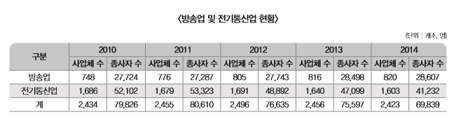 | 방송업 | 748 | 27,724 | 776 | 27,287 | 805 | 27,743 | 816 | 28,498 | 820 | 28,607 |