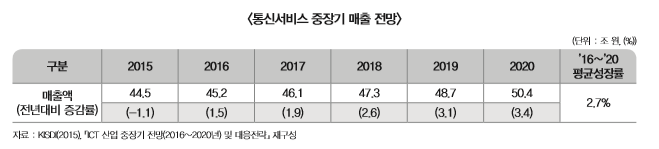 정보통신정책연구원(2015)의 「ICT 산업 중장기 전망(2016~2020년) 및 대응전략」에 따르면, 유선전화·초고속인터넷 등 유선통신서비스 매출감소와 이동통신 신규 요금제 도입으로 인한 일시적인 매출감소로 2015년 통신서비스 매출은 전년대비 1.1% 감소한 44조 5천억 원으로 추정되는 반면, 데이터 중심요금제 및 LTE 요금제로의 이행은 가입자당 평균매출(ARPU) 증가에 힘입어 2016년 통신서비스의 매출은 전년대비 1.5% 증가한 45조 2천억 원으로 전망된다.