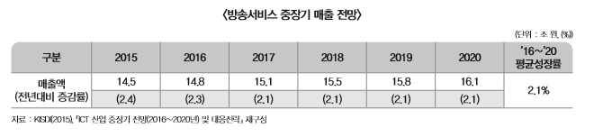한편, 정보통신정책연구원(2015)의 동 자료에 따르면, 방송서비스의 2015년 매출은 전년 대비 2.4% 증가한 14조 4,958억 원으로 전망되고, 2016년 매출은 전년 대비 2.3% 증가한 14조 8,280억 원으로 전망되며, 2016~2020년의 매출은 연평균 2.1%의 성장을 보여 2020년에는 약 16.1조 원 규모를 형성할 것으로 전망된다.